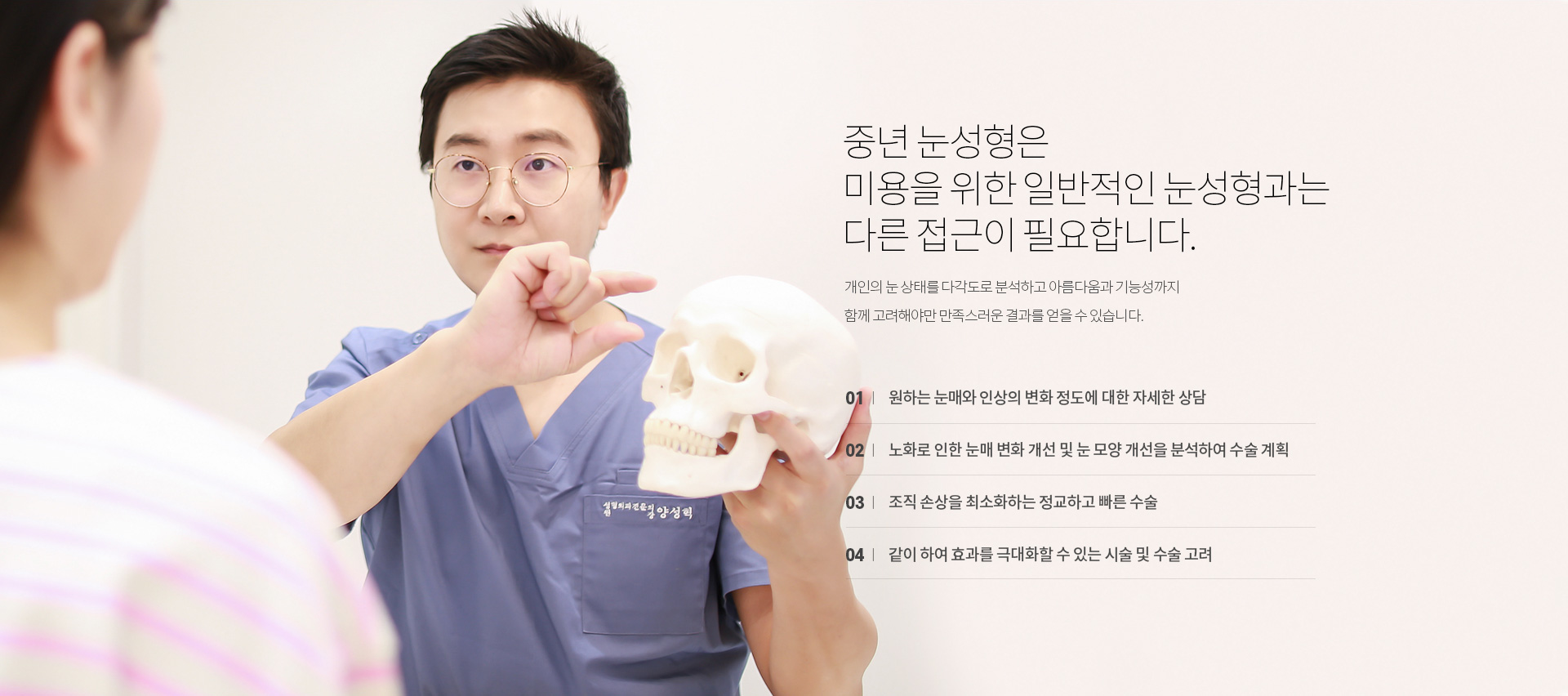 눈 주위 지방 분포 분석 등 고객의 다양한 증상을 정확히 분석하여 수술이 이루어집니다.
